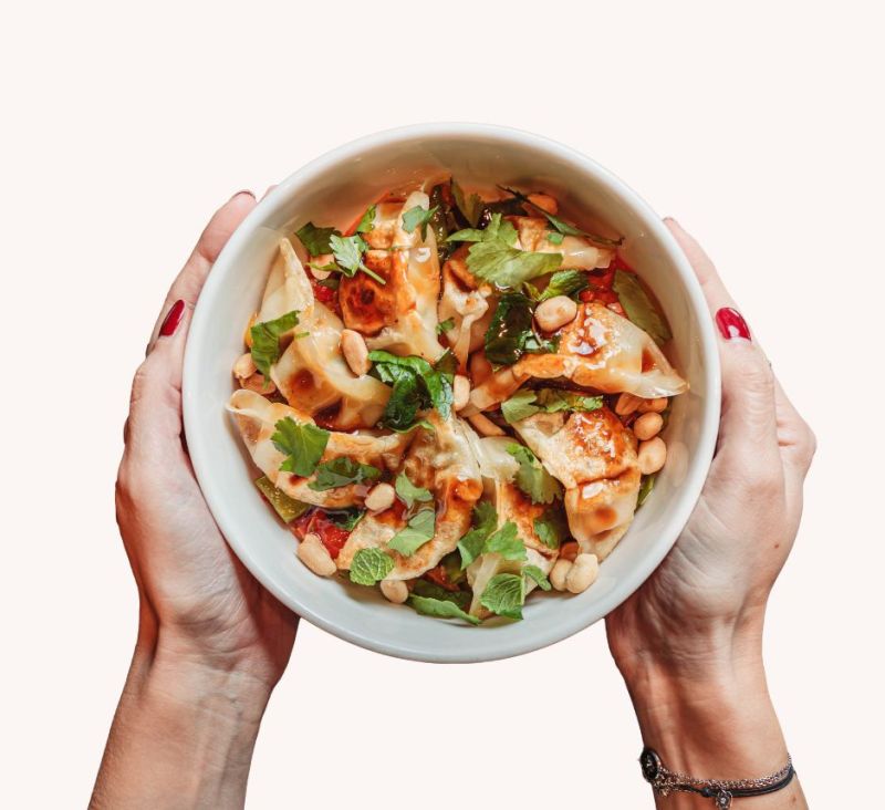 Gyoza De Boeuf, Wok De Légumes, Sauce Chili, Oignons Frits