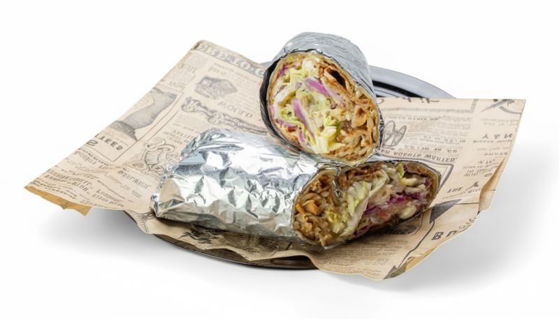 Galette Fine Enroulée Autour De Viande Kebab De Poulet Et Dinde Légumes Frais Et Sauce Au Choix.