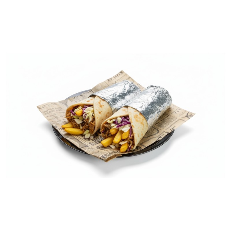 Galette Fine Enroulée Autour De Viande Kebab De Poulet Et Dinde Légumes Frais Et Sauce Au Choix Plus Frites A L'intérieur.