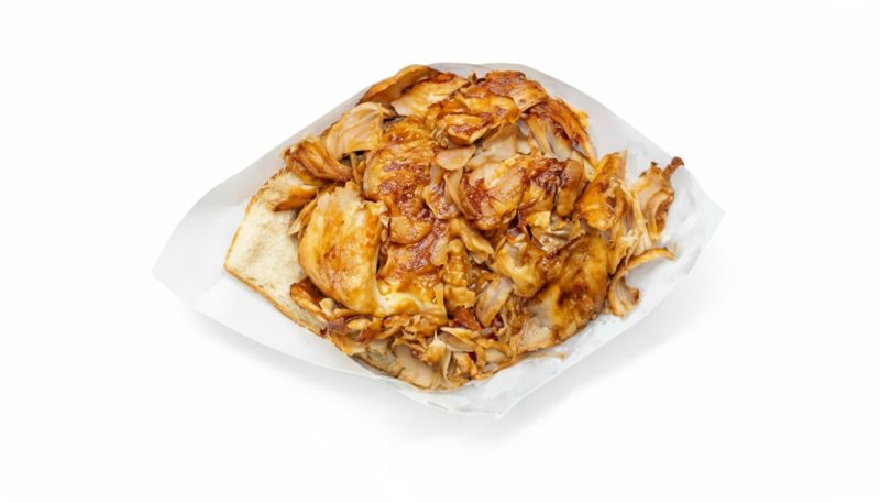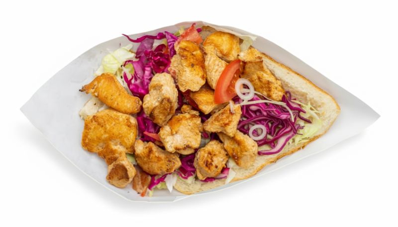 Pain Garni De Morceaux De Poulet Marinés Et Grillés Dans Du Pain Frais , Servis Avec Sauce Au Choix Plus Frites A L'intérieur.