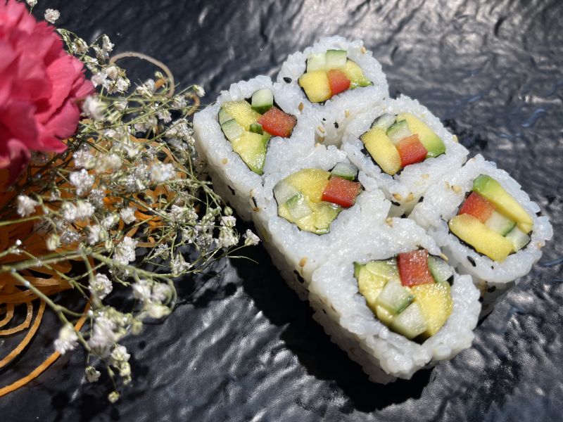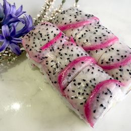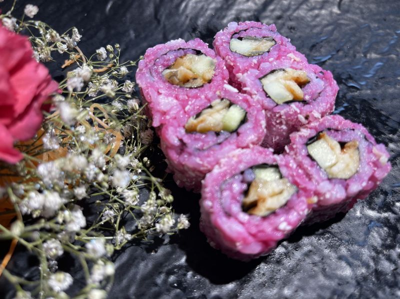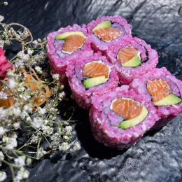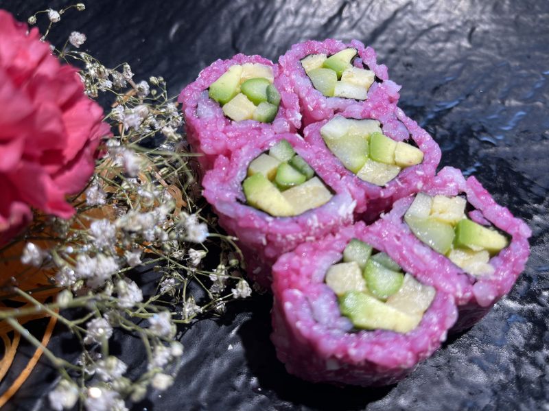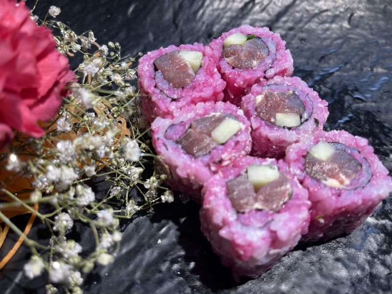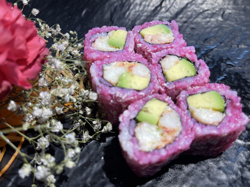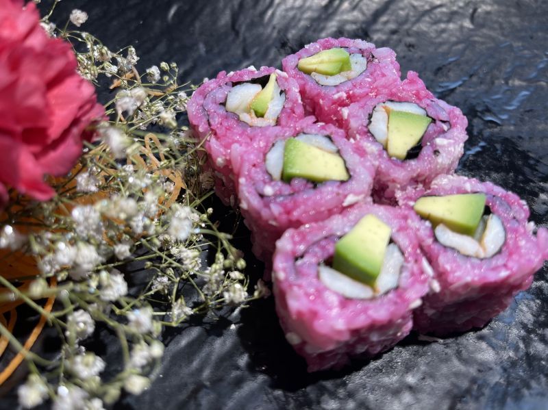 Maki inversé avec riz à l’extérieur coloré à la betterave rouge et copeaux de noix de coco