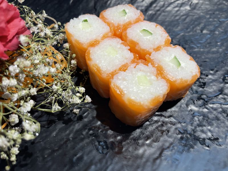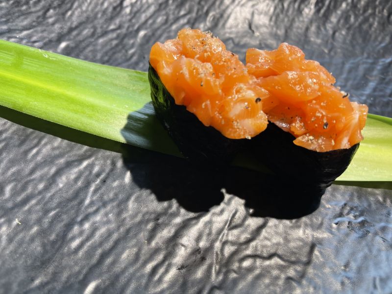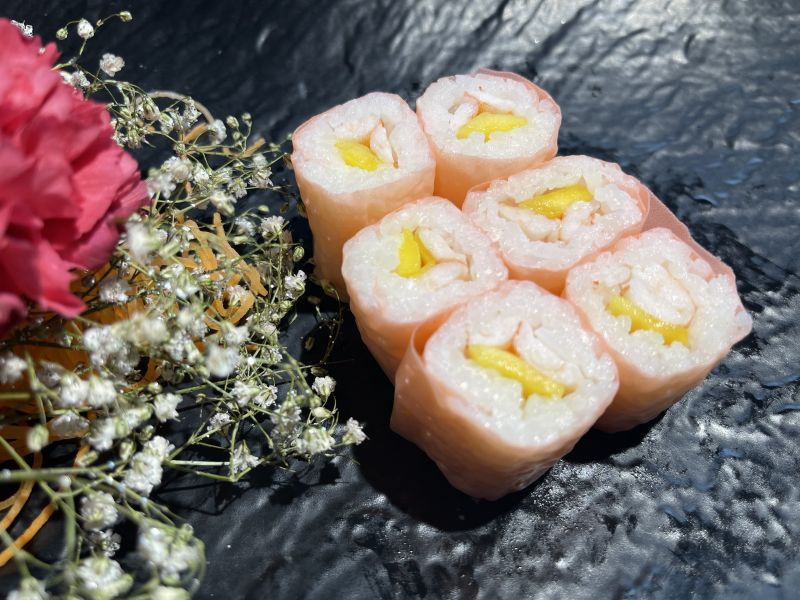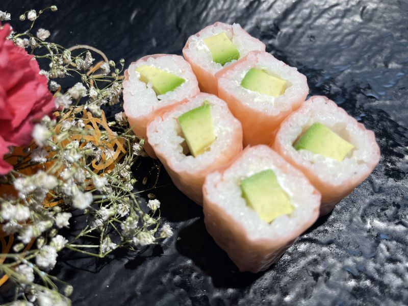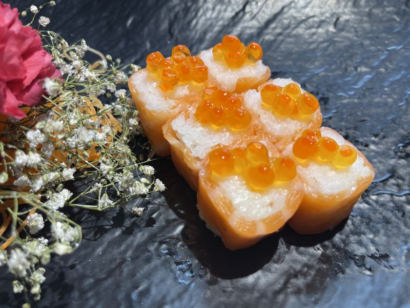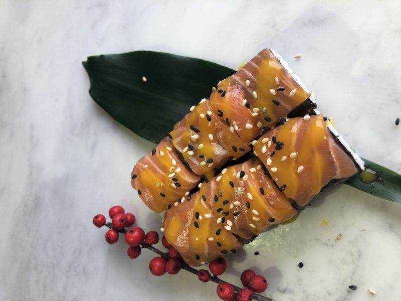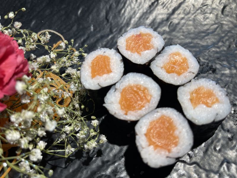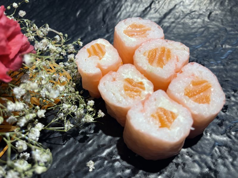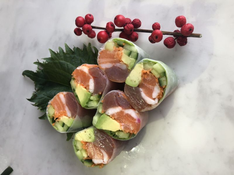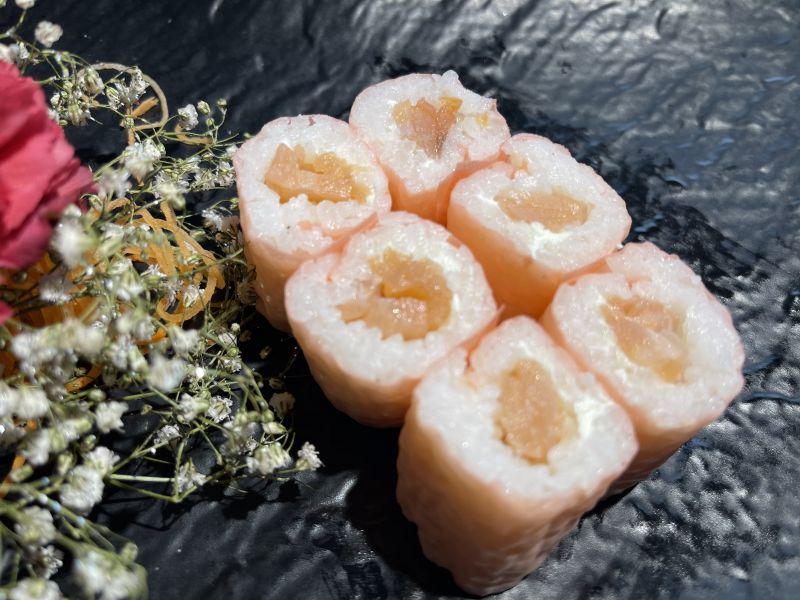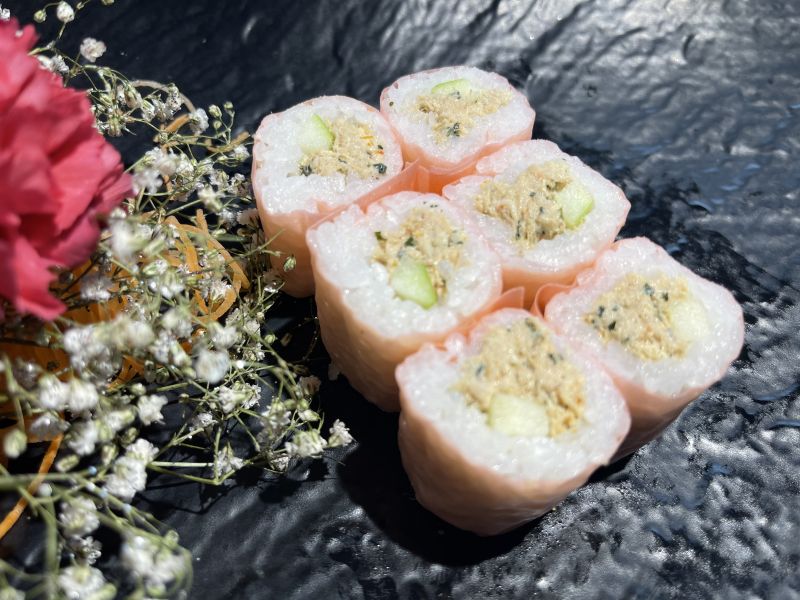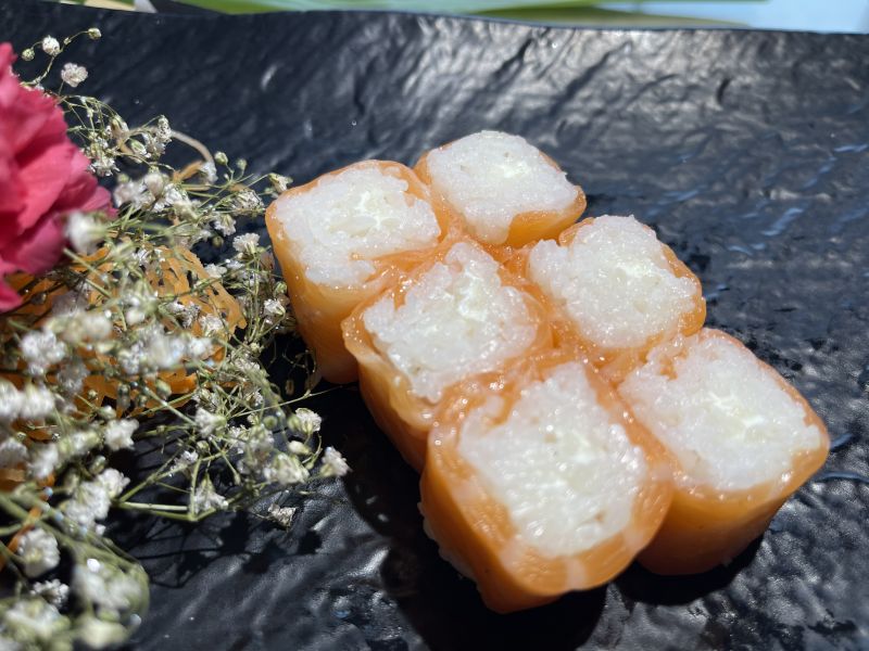 Riz et poisson enroulés dans une tranche de saumon fraîche