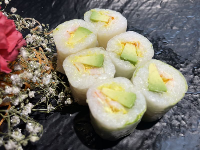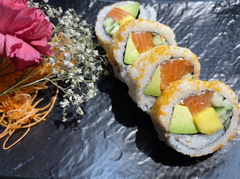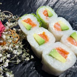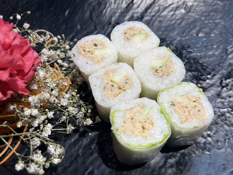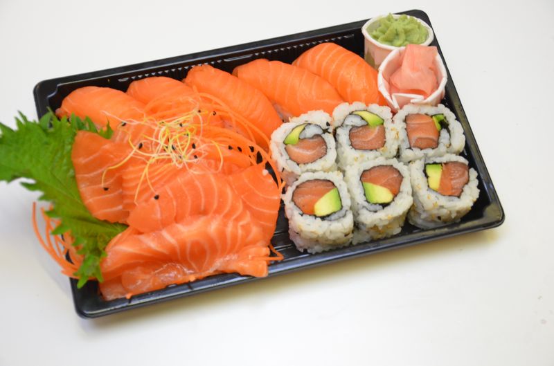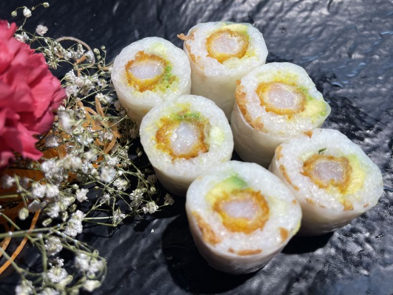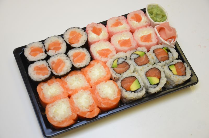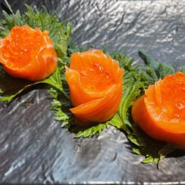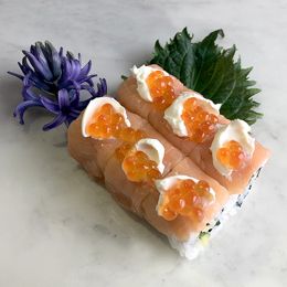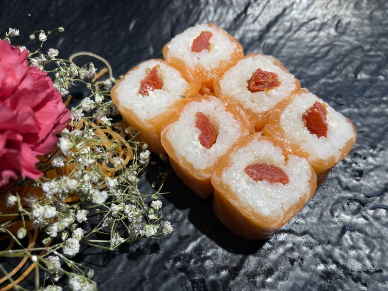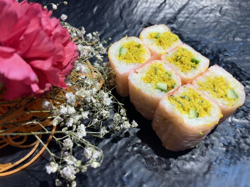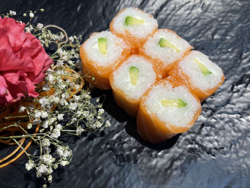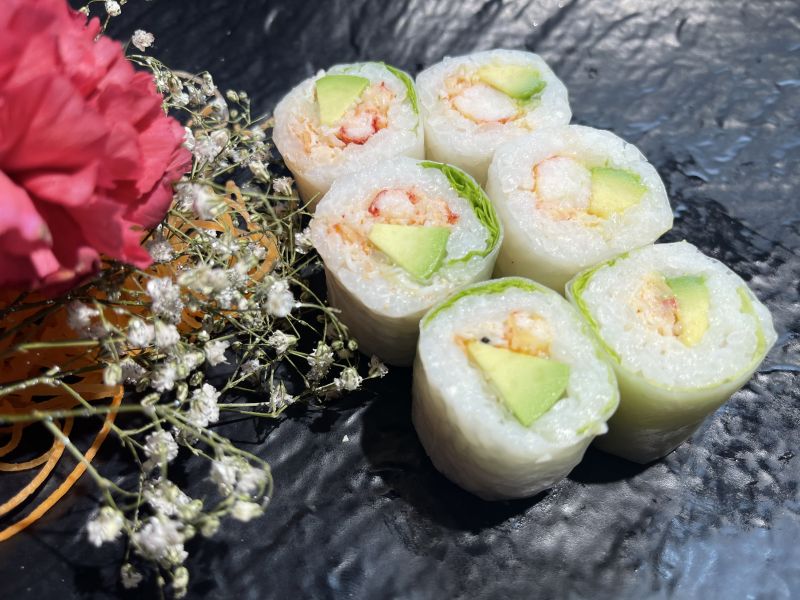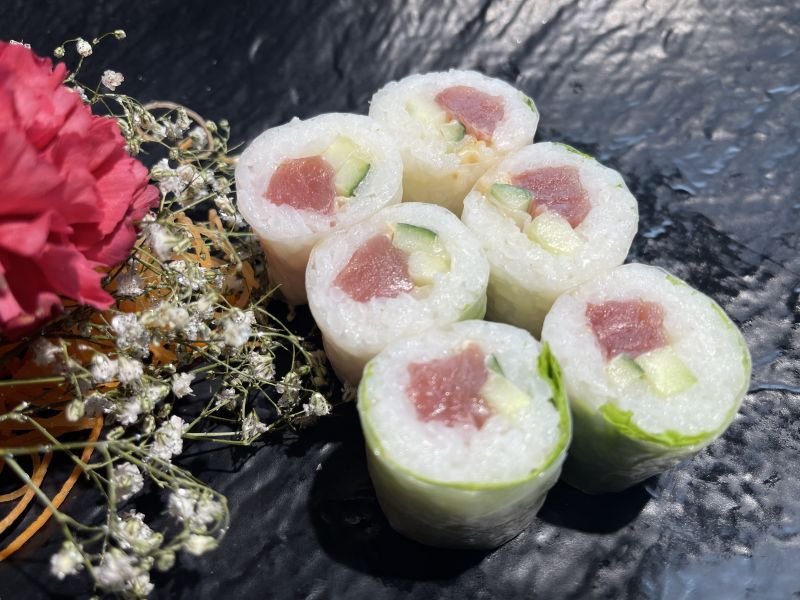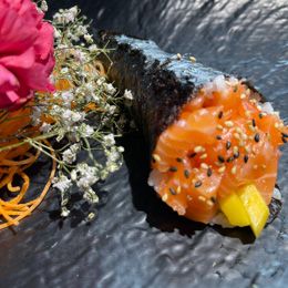 Riz et poisson enroulés dans une tranche de saumon fraîche