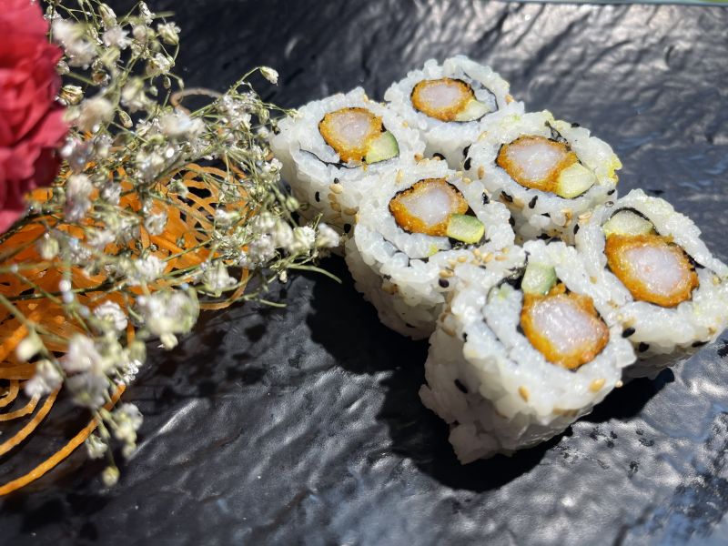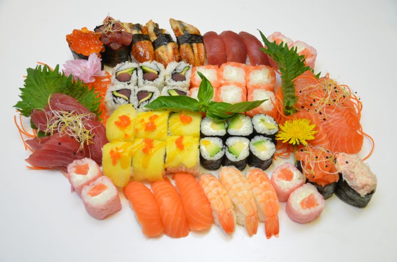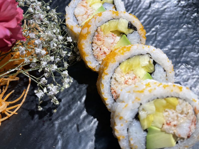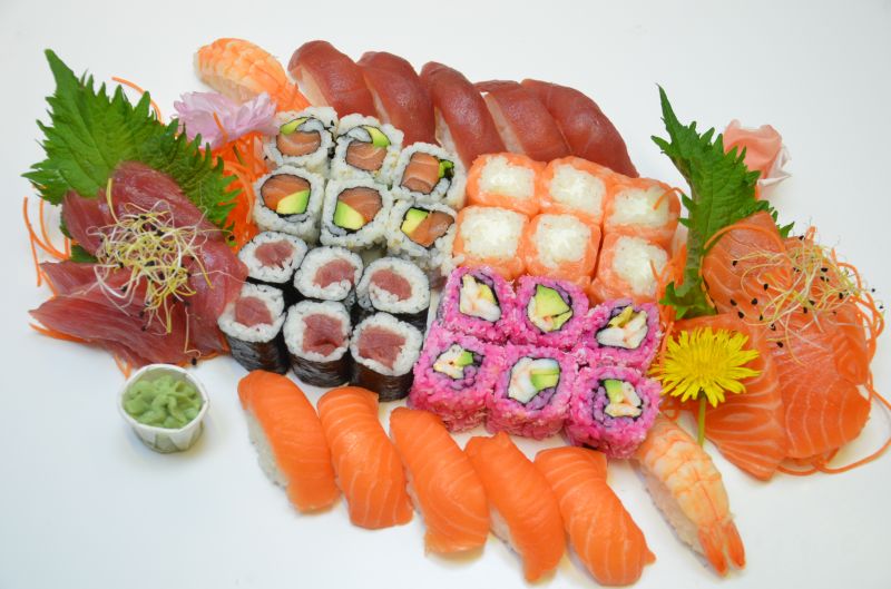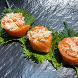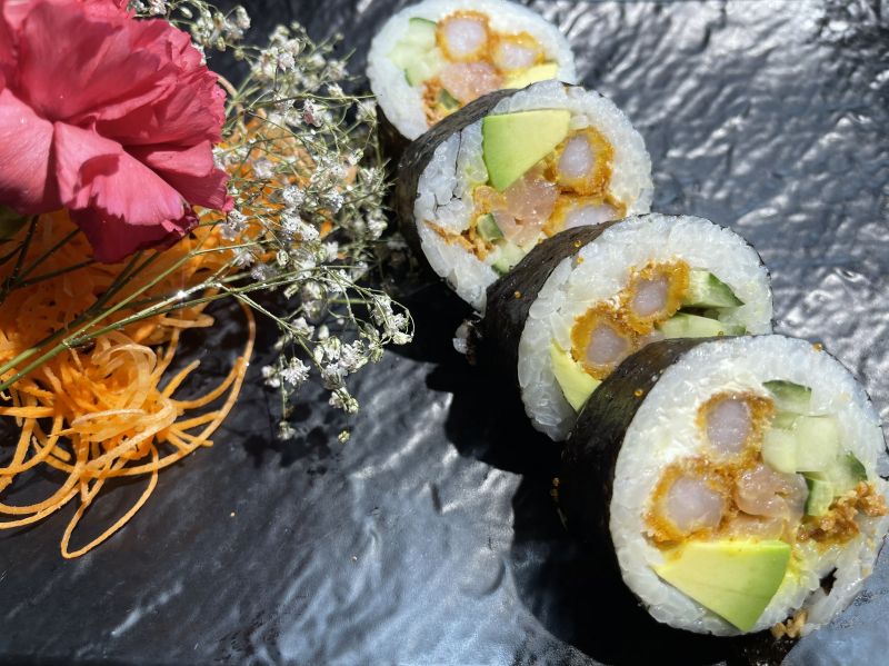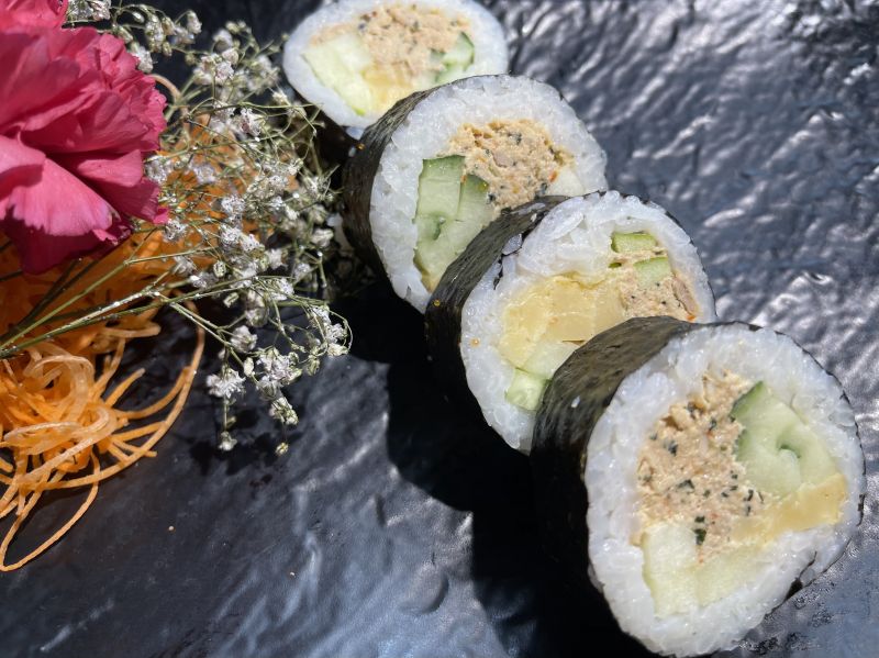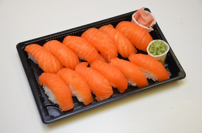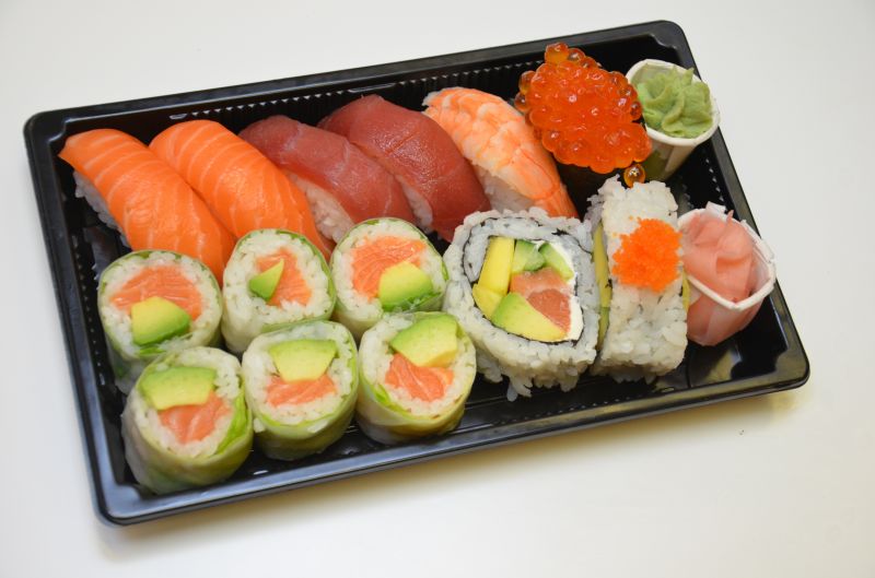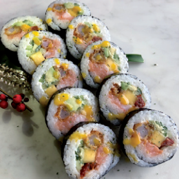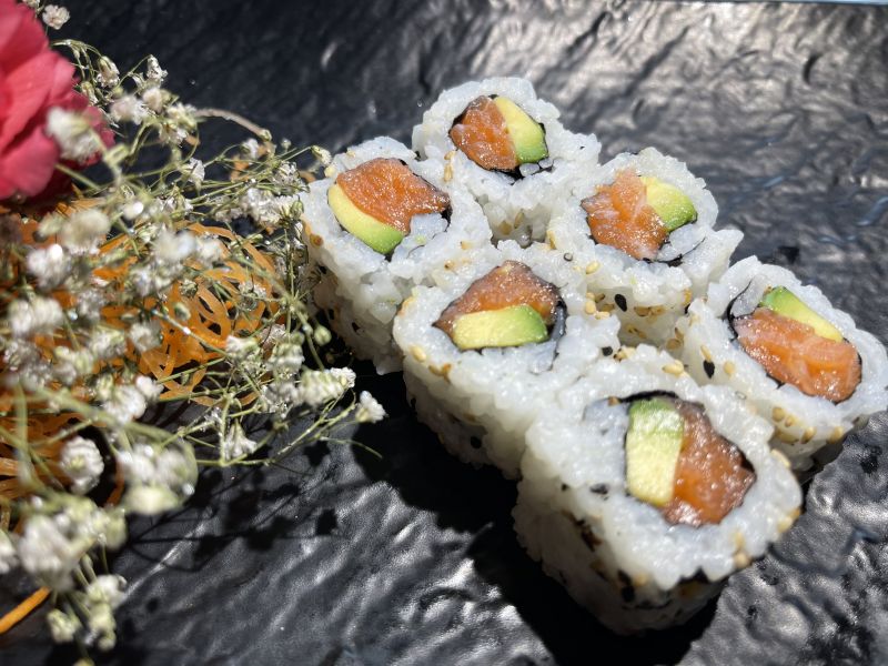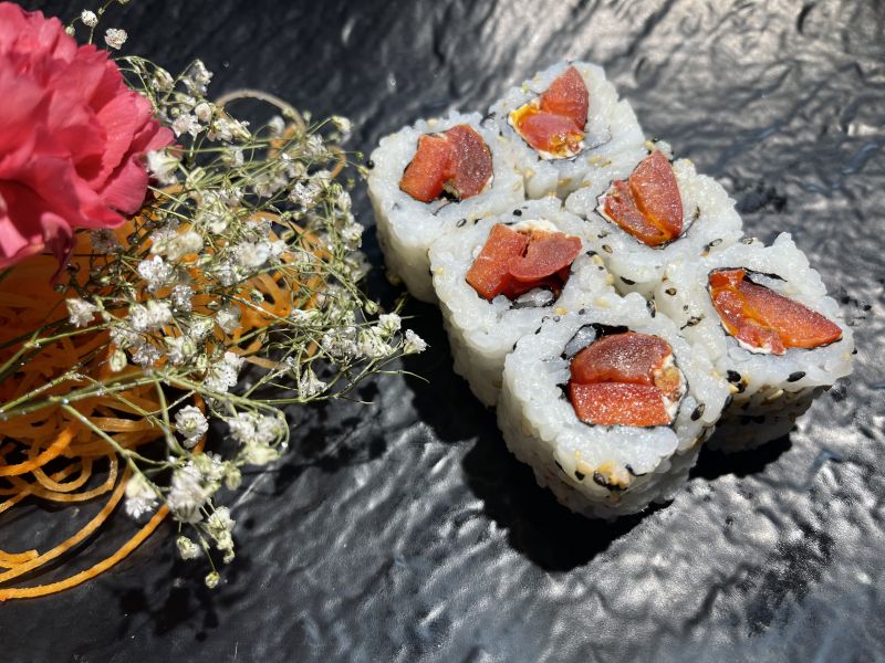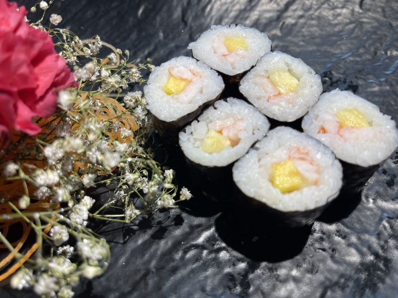 Riz et poisson enroulés dans une tranche de saumon fraîche