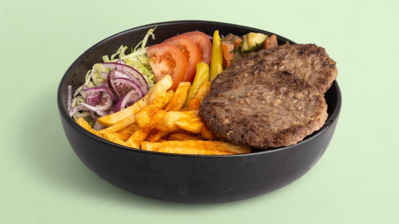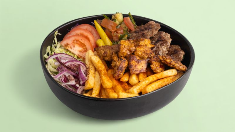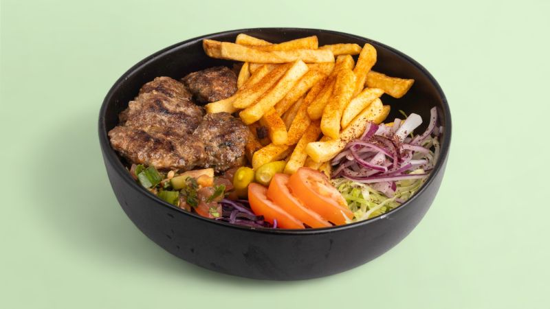 Viande De Poulet Marinée Et Boeuf Haché Avec Ses Crudités Et Frites Ou Boulgour